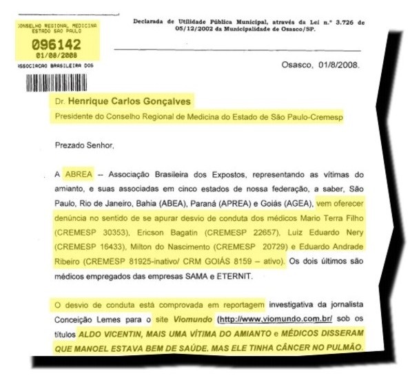 Baseados nas reportagens Aldo Vicentin, mais uma vítima do Amianto e Médicos disseram que Manoel estava bem de saúde. Mas ele tinha câncer no pulmão, publicadas pelo Viomundo, a Abrea solicitou ao Conselho Regional de Medicina do Estado de São Paulo (Cremesp) e às instituições envolvidas a apuração das denúncias. A Abrea representa milhares de vítimas do amianto no País, organizadas em seis estados da nossa federação — São Paulo, Rio de Janeiro, Bahia, Paraná, Goiás e, mais recentemente, Minas Gerais.