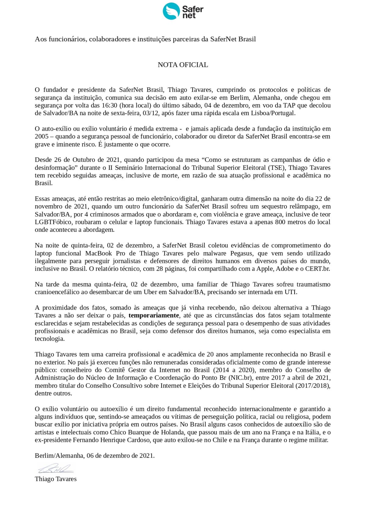 “A proximidade dos fatos, somado às ameaças que já vinha recebendo, não deixou alternativa a Thiago Tavares a não ser deixar o país, temporariamente, até que as circunstâncias dos fatos sejam totalmente esclarecidas e sejam restabelecidas as condições de segurança pessoal para o desempenho de suas atividades profissionais e acadêmicas no Brasil, seja como defensor dos direitos humanos, seja como especialista em tecnologia”, diz a nota da SaferNet.