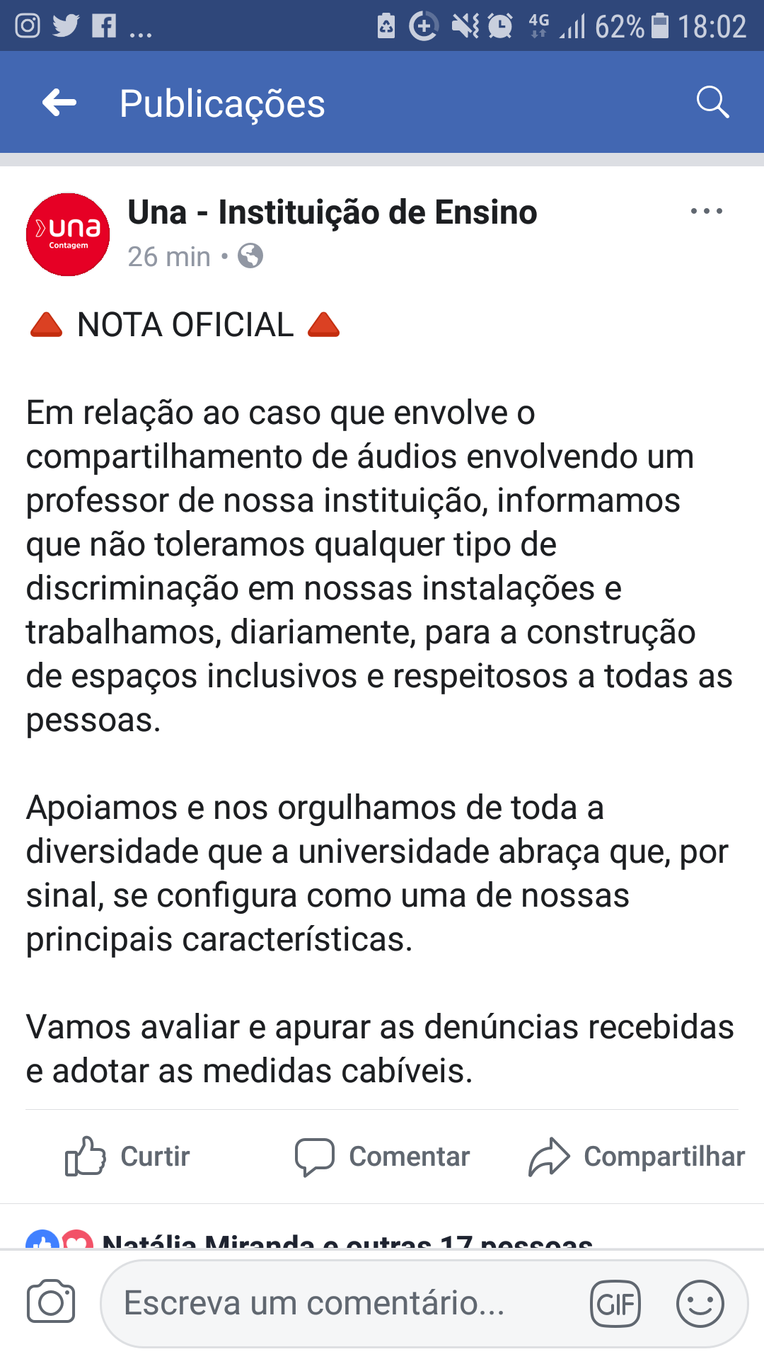Ou seja, 24 horas após o áudio cair na web e 21 horas depois da UNA dizer em nota que não tolera qualquer tipo de discriminação em suas instalações e que já havia aberto processo administrativo para apurar a denúncia.
