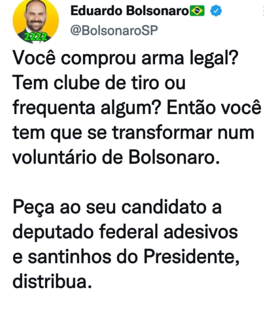 O filho do presidente da República publicou um post no Twitter onde convoca todos aqueles que possuam armas de fogo e/ou sejam proprietários de estandes de tiros para fazer campanha de reeleição para Jair Bolsonaro no dia 7 de setembro.