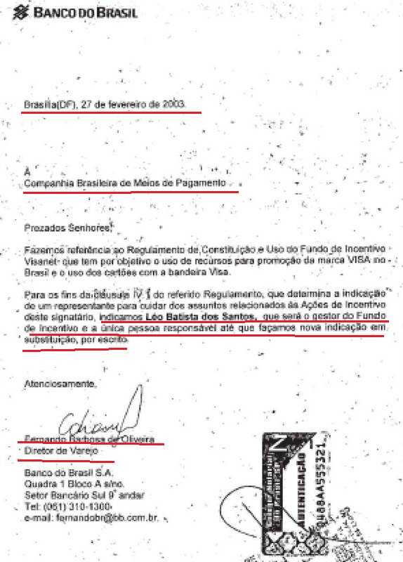 Assim, de 2003 a 2005, período em que Pizzolato era diretor de Marketing e Comunicação do Banco do Brasil, todos os documentos enviados à Visanet foram assinados por Léo Batista dos Santos e seu representante, Douglas Macedo.