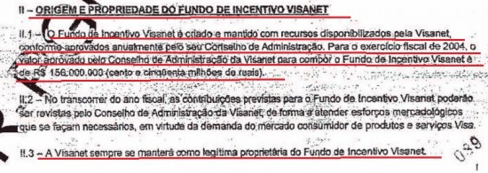Basta ler a cláusula que diz respeito à origem e à propriedade do dinheiro. O valor aportado para o Fundo de Incentivo Visanet era aprovado pelo Conselho de Administração da Visanet. Em fevereiro de 2004, por exemplo, ele designou para aquele ano R$ 156 milhões.