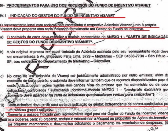 O Regulamento/Contrato determinava que cada banco parceiro, caso quisesse utilizar os recursos do Fundo Visanet, deveria indicar um representante, um gestor. Para isso, o banco deveria apresentar uma carta formalmente indicando-o.