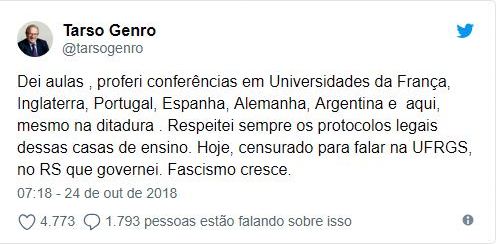No Twitter, o ex-governador Tarso Genro criticou a decisão, lembrando aulas e palestras em universidades do mundo todo. “Hoje, censurado para falar na UFRGS, no RS que governei. Fascismo cresce”, escreveu ele.