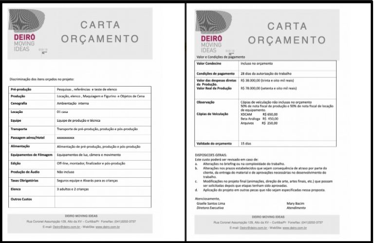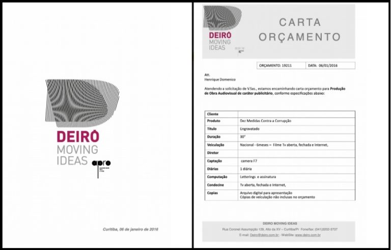 Um deles é esse que se vê no alto: trata-se do orçamento enviado pela produtora, que, obviamente, não comete crime nenhum e está apresentando o que lhe foi encomendado. Certamente Deltan há de reconhecer a sua autenticidade, não é mesmo?