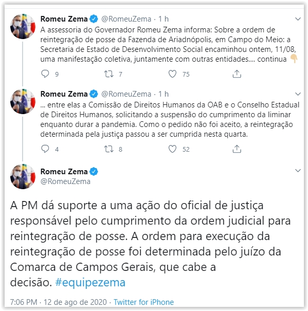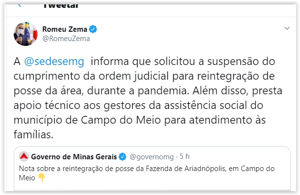 17h24 — Zema tuita que a Secretaria de Desenvolvimento Social havia solicitado a suspensão do cumprimento da ordem judicial para reintegração de posse durante a pandemia.