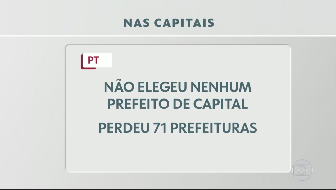 E, em destaque a constatação: “O PT foi o grande derrotado nessa eleição. Pela primeira vez desde a redemocratização, não elegeu nenhum prefeito de capital e perdeu 71 prefeituras. Caiu de 254 para 183. Mas nomes de outros partidos de esquerda ganharam protagonismo”.
