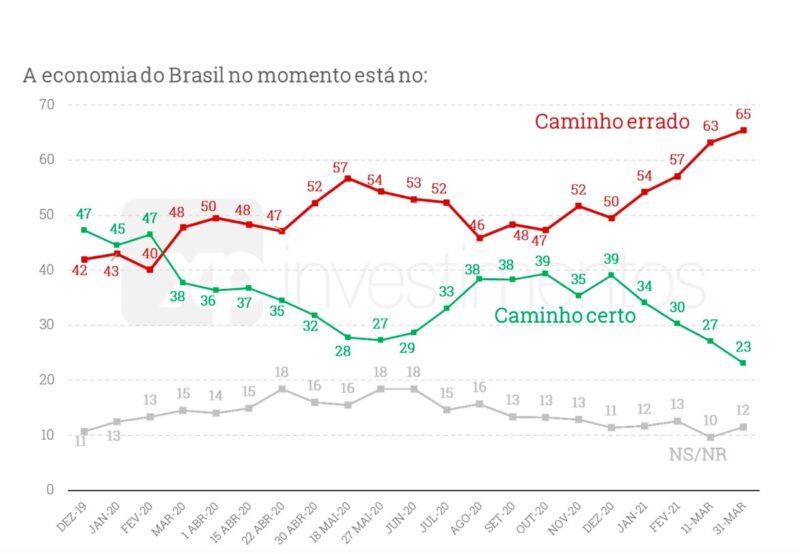 Outro dado bastante interessante mostrado pela pesquisa – que possivelmente garimpou bem os entrevistados – é de que a economia está indo num caminho muito equivocado. 65% dos entrevistados dizem que ela está no caminho errado, e somente 23% dizem que a economia está no caminho certo.