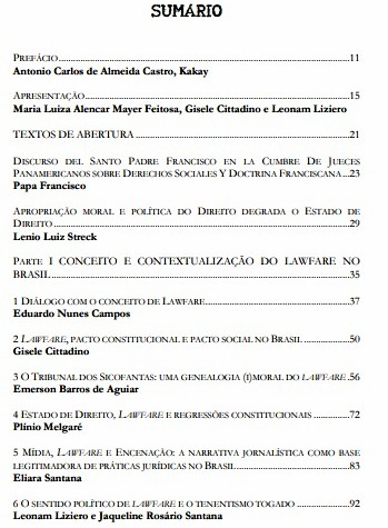 Na obra, a partir dessas reflexões, insere-se a perspectiva da discussão também sobre o lawfare, uma espécie de guerra jurídica, e suas implicações muito perigosas para a democracia no Brasil e a constituição do Estado de Direito.