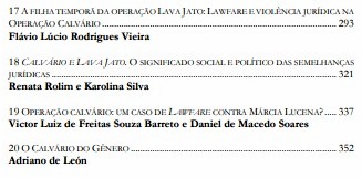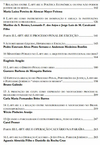 Apresentando reflexões muito importantes sobre as ações e dos posicionamentos do Poder Judiciário a partir dessa conjuntura do surgimento da Lava Jato, o livro revela uma ação abusiva na atuação dessa instância. como ressaltam os organizadores, “o principal foco da obra que ora temos a alegria e o prazer de apresentar ao(à) leitor(a) é precisamente a discussão sobre como o Poder Judiciário e o Ministério Público, mediante especial e decisivo amparo da grande mídia brasileira, se transformaram, paradoxalmente, nos atores políticos que estão a implementar a exceção no Brasil”.
