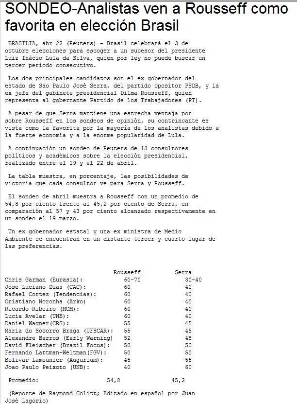 No Brasil, o fato de que a principal emissora de televisão resolveu divulgar apenas os resultados de dois intitutos — o Ibope, cujo presidente em 2009 já disse que Lula não fará o sucessor; e o Datafolha, de um jornal que abriu as páginas para atacar um concorrente, o Sensus, ajudando assim a “desqualificá-lo” — já serve de alerta.