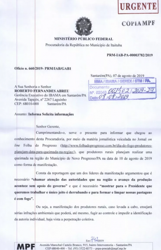 Em 7 de agosto o Ministério Público Federal de Itaituba, no Pará, informou à gerência do Ibama em Santarém, também no Pará, sobre o Dia do Fogo.