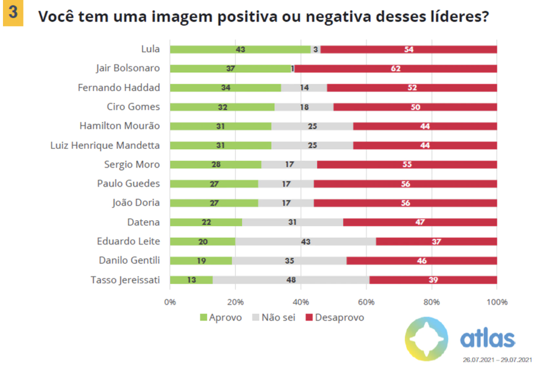Além disso, pesquisa publicada pela versão brasileira do diário espanhol El Pais, feita pelo Atlas Político, mostra que Bolsonaro tem rejeição recorde de 62% e hoje perderia no segundo turno para cinco candidatos, inclusive o governador paulista João Doria.