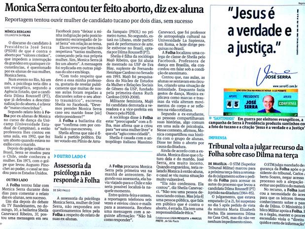 Diante de matéria publicada hoje, a campanha de Jose Serra esclarece: Monica Serra nunca fez um aborto. Essa acusação falsa, que já circulava antes na internet, repete o padrão Miriam Cordeiro de que o então candidato Luiz Inácio Lula da Silva foi vítima na eleição de 1989. E dá continuidade ao jogo sujo que tem caracterizado a presente campanha desde que um núcleo do PT, montado para fazer dossiês contra o candidato tucano à Presidência, foi descoberto em Brasília. Primeiro eles atacaram a filha de José Serra. Depois atacaram o seu genro. Agora eles agridem a sua mulher, Monica, que tem a irrestrita solidariedade, amor e respeito de seu marido, de seus filhos, netos e de milhões de brasileiros.