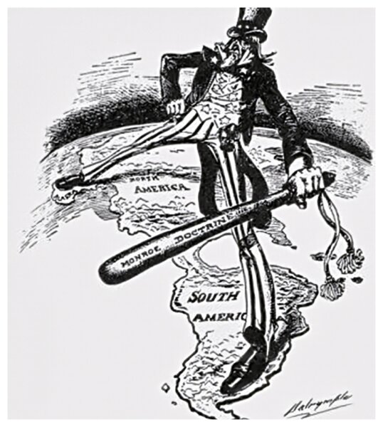 Esta ilustração, de 1905, do cartunista estadunidense Louis Dalrymple é atual. Tio Sam gigantesco, com um pé na América do Norte e o outro na América do Sul, e, na mão, o porrete com a inscrição “Doutrina Monroe”