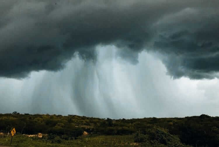 uma enorme cortina escura, formada por nuvens espessas, envolve o sertão.