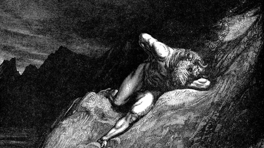 o trompetista toca a marcha fúnebre e o diabo entra na gruta escura, recolhendo o rabo de seta em brasas.