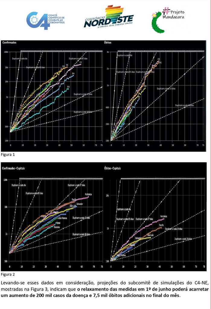 projeções do subcomitê de simulações do C4-NE indicam que o relaxamento das medidas em 1º de junho poderá acarretar um aumento de 200 mil casos da doença e 7,5 mil óbitos adicionais no final do mês.
