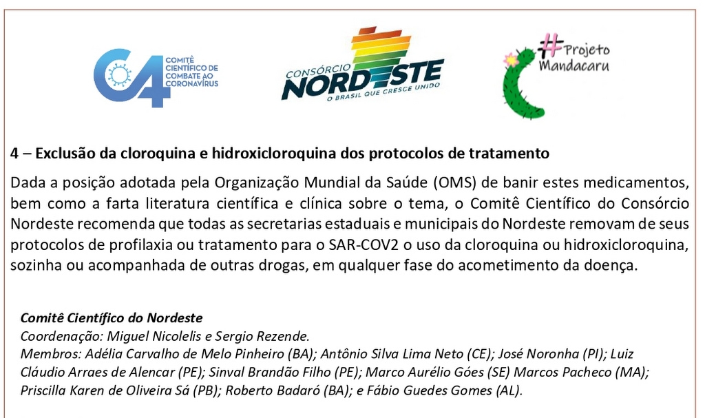 todas as secretarias estaduais e municipais do Nordeste removam de seus protocolos de profilaxia ou tratamento para o SAR-COV2 o uso da cloroquina ou hidroxicloroquina, sozinha ou acompanhada de outras drogas, em qualquer fase do acometimento da doença.