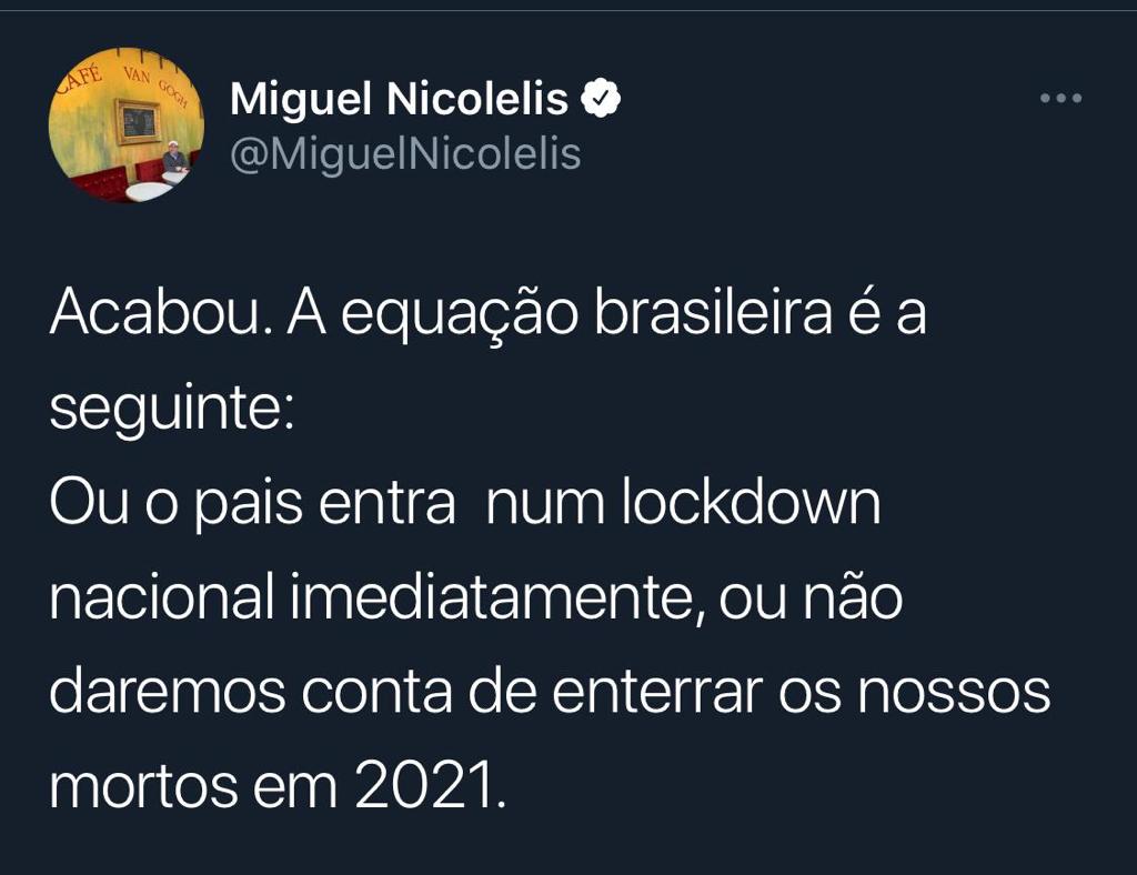 “Acabou. A equação brasileira é a seguinte: ou o país entra num lockdown nacional imediatamente, ou não daremos conta de enterrar os nossos mortos em 2021.” Essa mensagem foi escrita no Twitter pelo neurocientista Miguel Nicolelis, mundialmente famoso por suas pesquisas sobre a interface entre cérebros e máquinas.