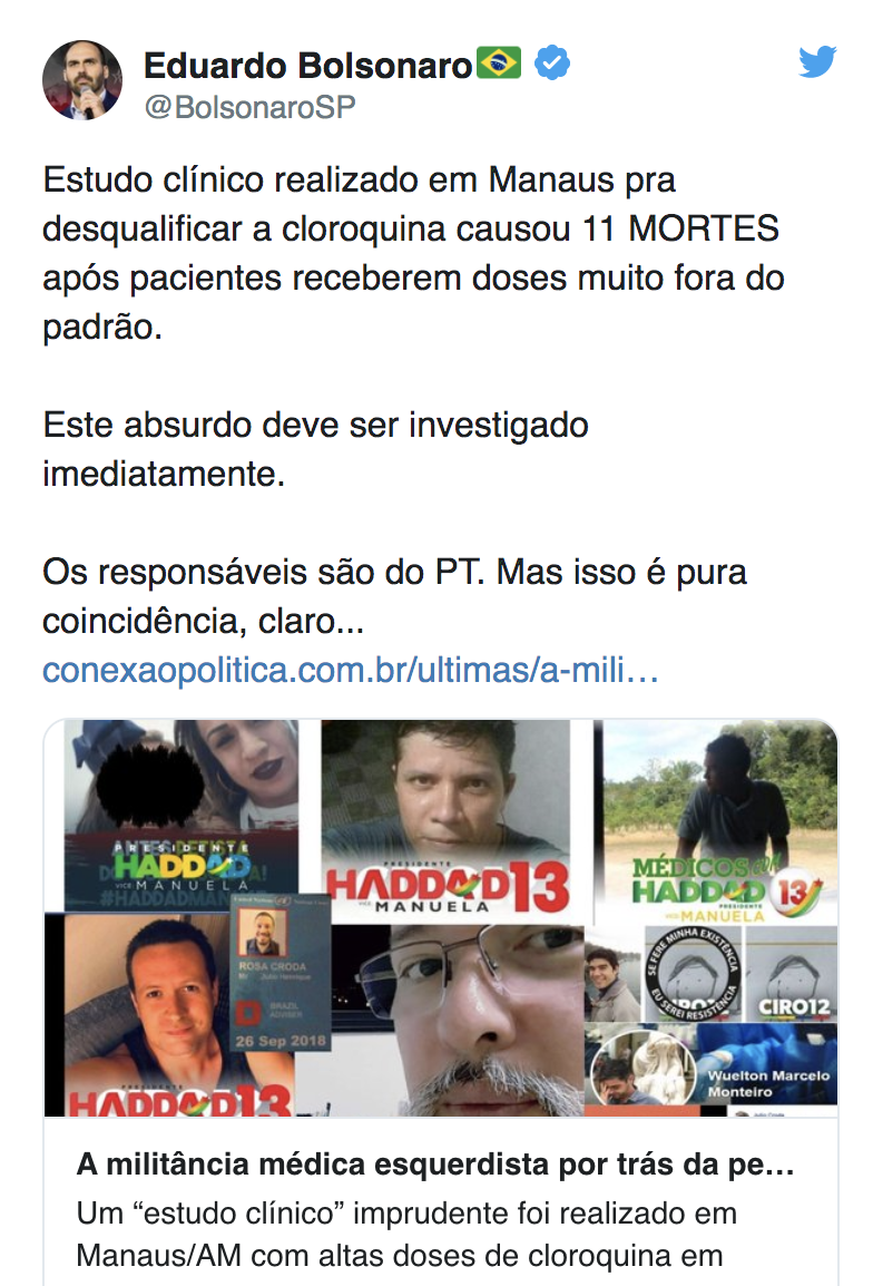 Os pesquisadores não possuem quaisquer vinculações ideológicas ou partidárias e seu compromisso é apenas com a boa ciência. Não emitimos opinião que não seja baseada em dados científicos. Os dados preliminares publicados no MedRxiv, com pacientes de Manaus, já foram atualizados, persistindo as mesmas conclusões, e estão nesse momento em avaliação por revisores de revista científica internacional muito conceituada no meio científico médico.