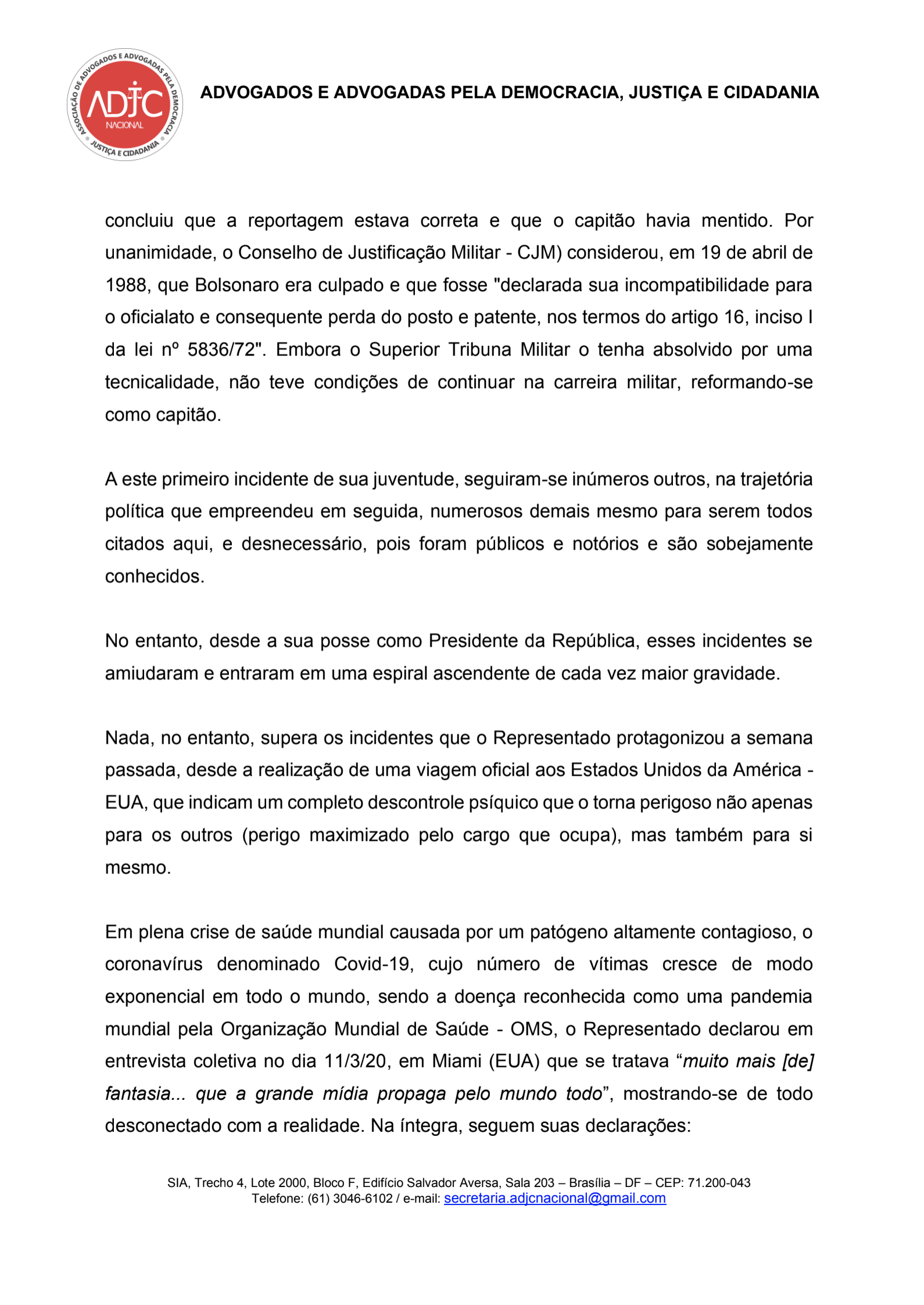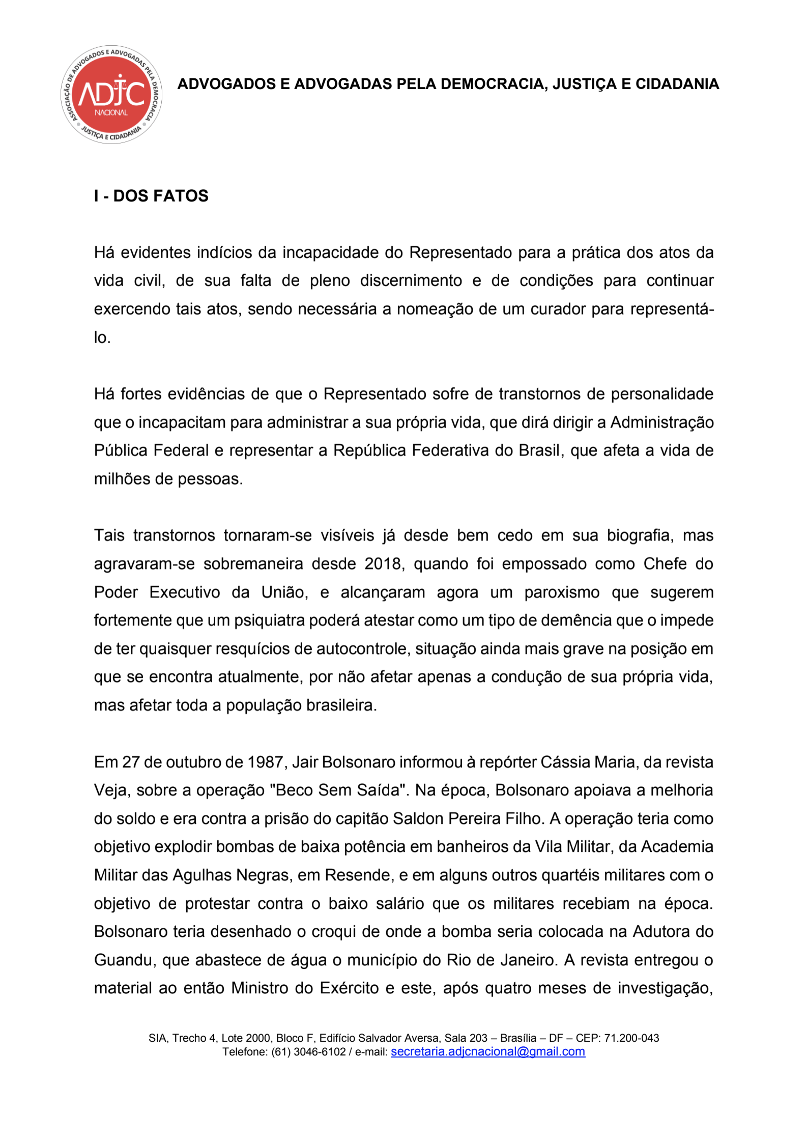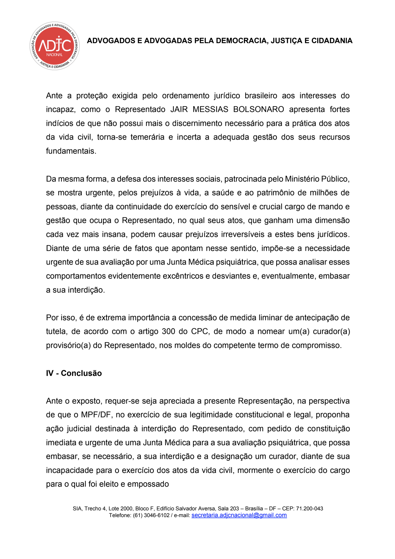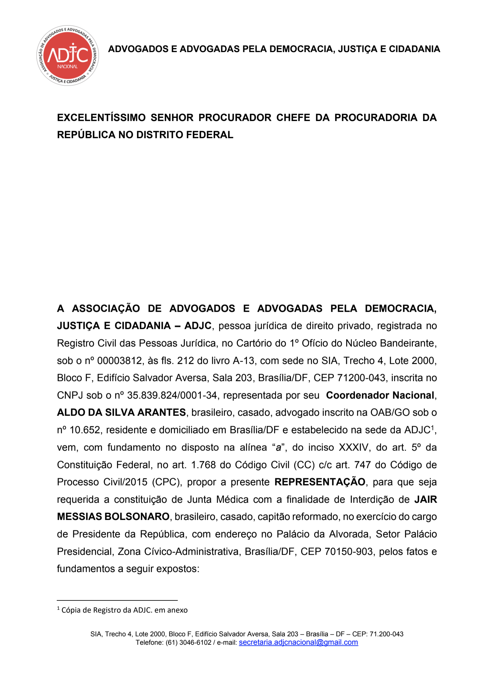 A Associação dos Advogados e Advogadas pela Democracia, Justiça e Cidadania (ADJC) representou junto à Procuradoria da República no Distrito Federal para que seja instituída uma junta médica psiquiátrica para avaliar o presidente da República, Jair Bolsonaro.