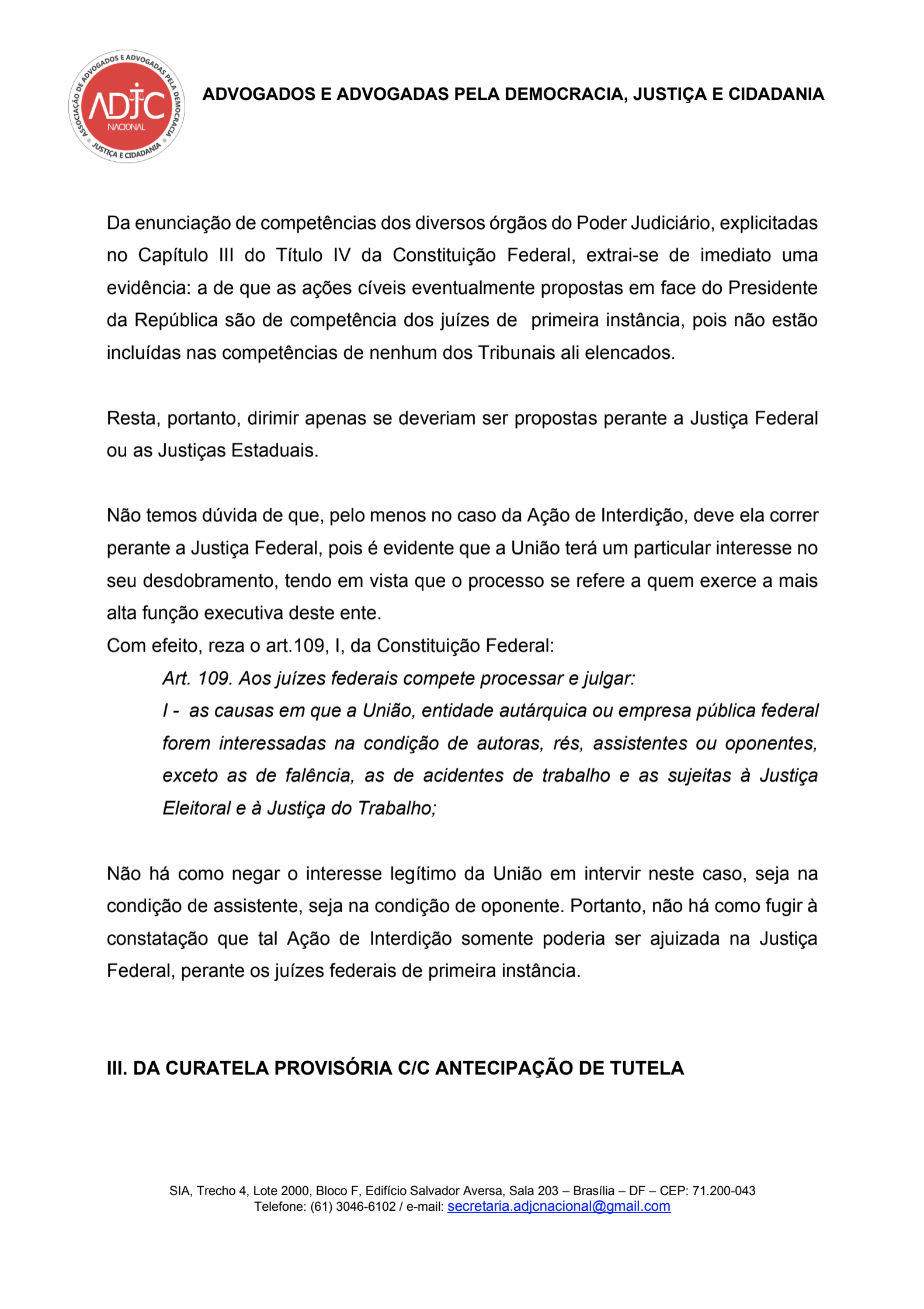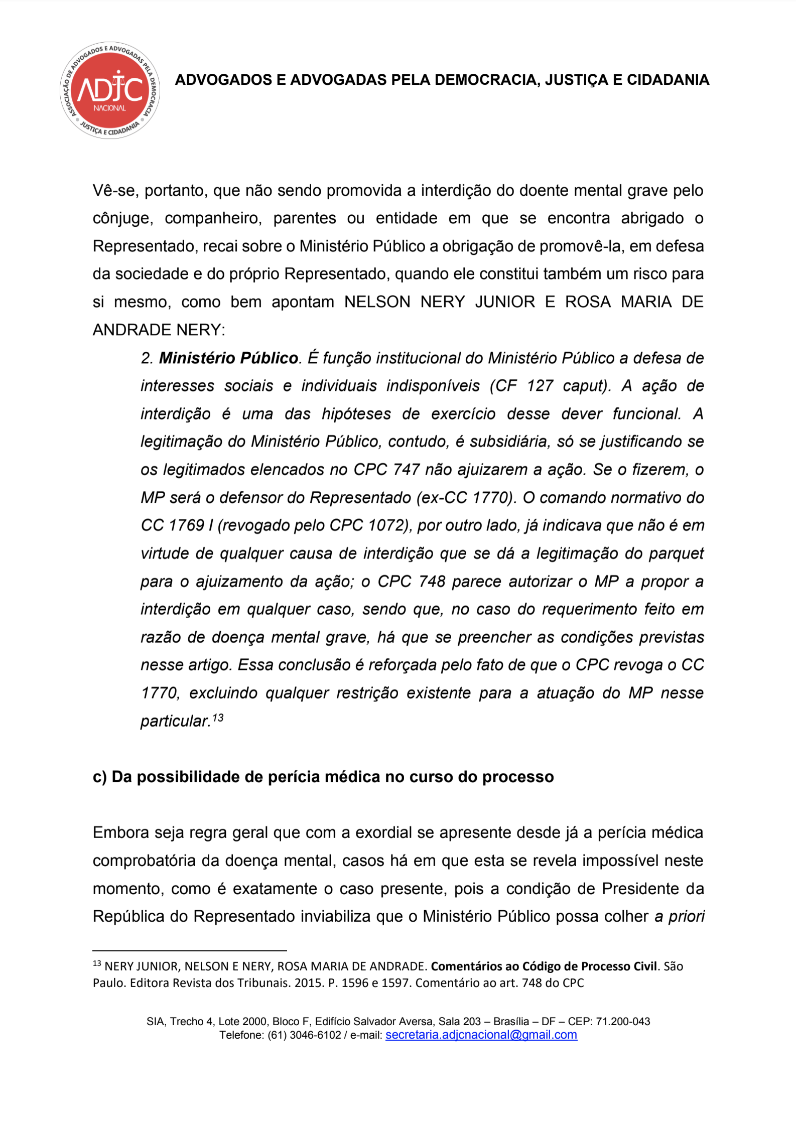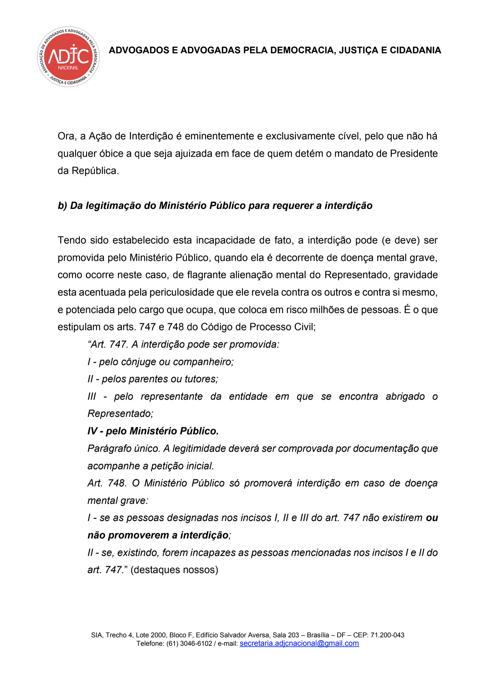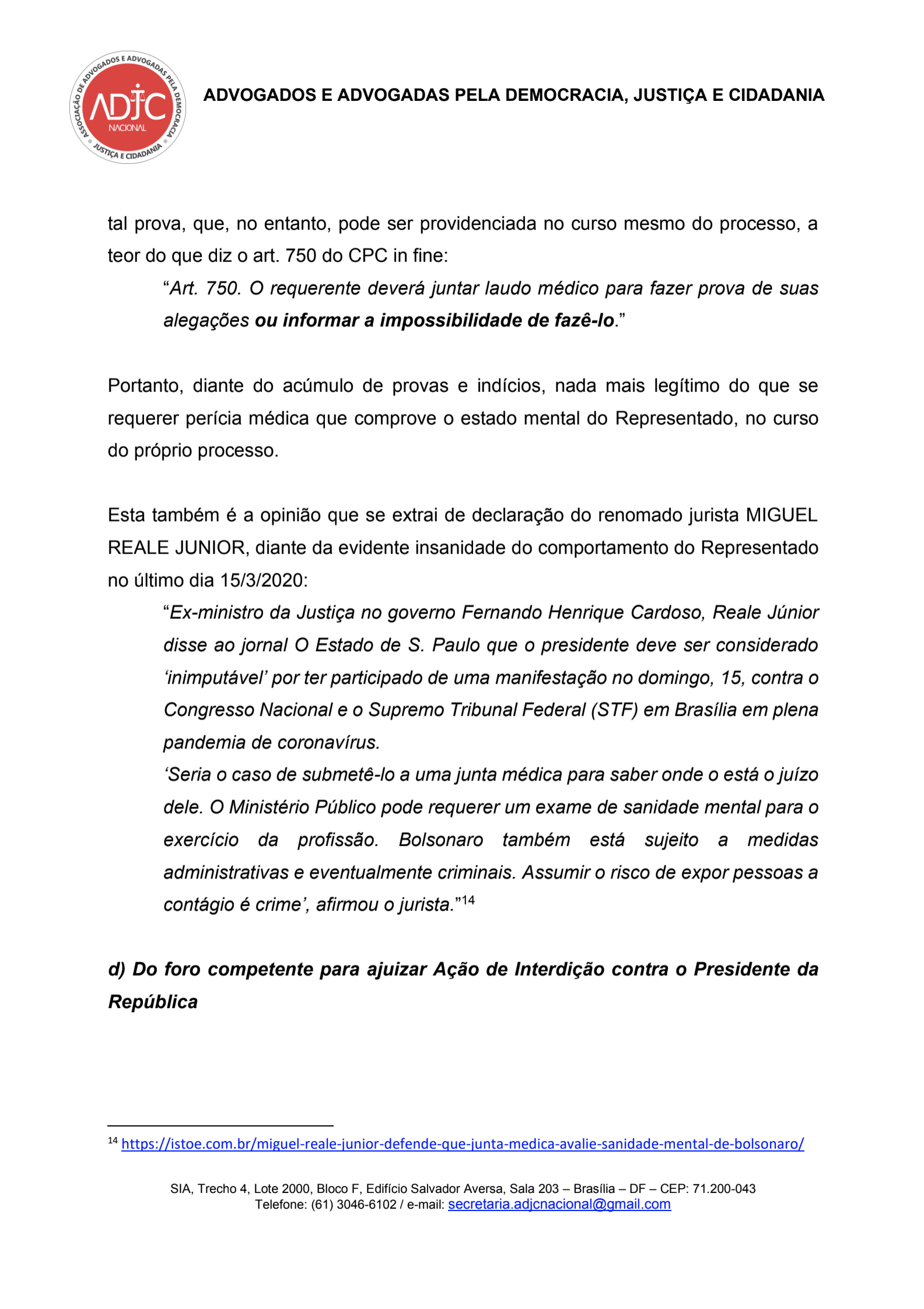 A Associação dos Advogados e Advogadas pela Democracia, Justiça e Cidadania (ADJC) representou junto à Procuradoria da República no Distrito Federal para que seja instituída uma junta médica psiquiátrica para avaliar o presidente da República, Jair Bolsonaro.