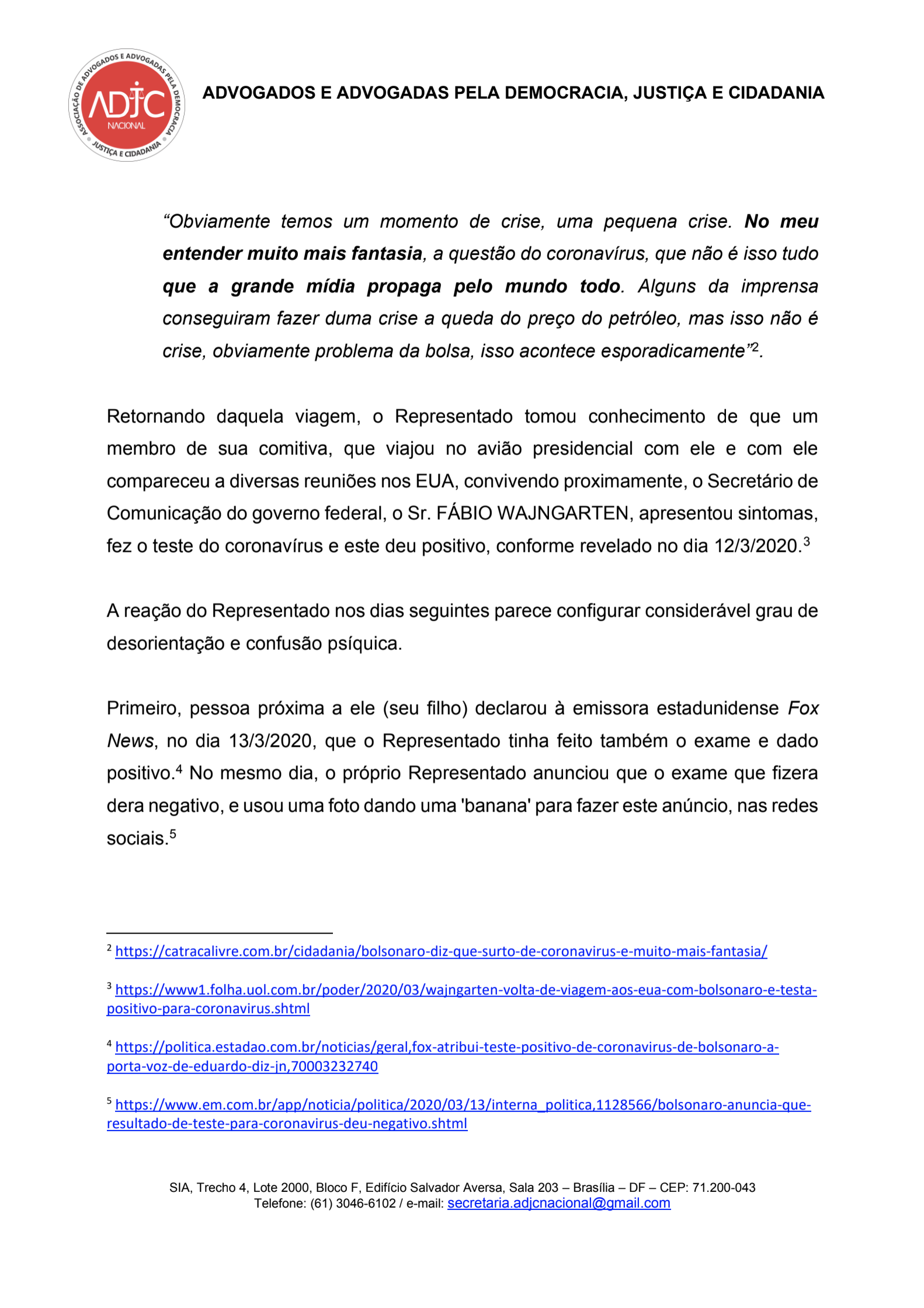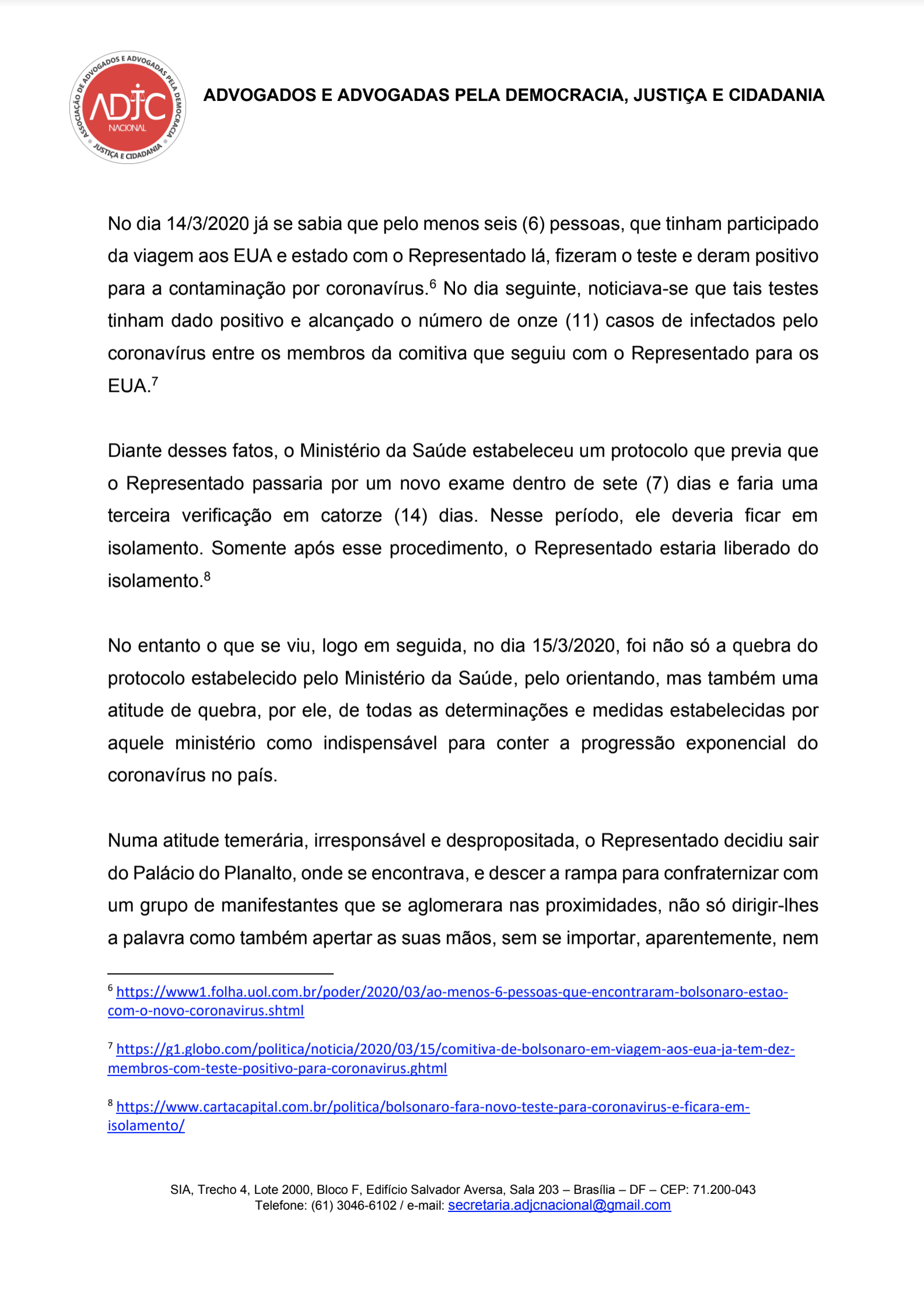 A petição não inclui as declarações mais recentes de Bolsonaro, feitas ao apresentador Ratinho, do SBT, nas quais o presidente da República voltou a minimizar os riscos do coronavírus, priorizando a preservação da economia.