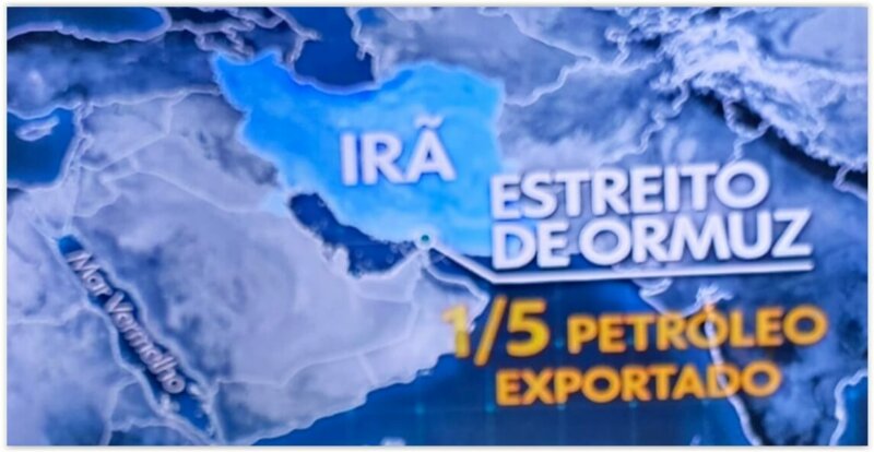 Não satisfeitos, os editores do JN e seus âncoras falam sobre o fechamento do Estreito de Ormuz, por onde passa 25% do carregamento de petróleo bruto mundial e grande parte do gás natural liquefeito (GNL) produzido na região, como se fosse algo que surgiu do nada e é da exclusiva responsabilidade do Irã.
