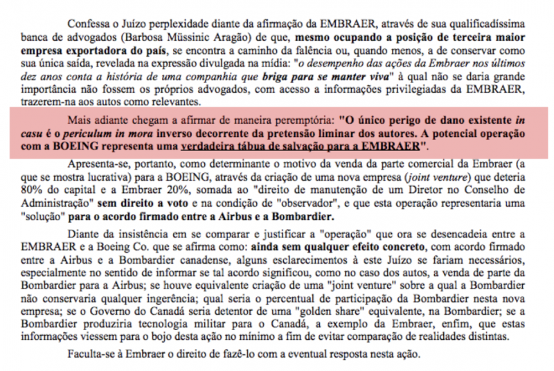 Em sua decisão, publicada na última quinta-feira 6, o magistrado revelou que os advogados da empresa, em documento anexado ao processo, afirmaram que “a verdadeira tábua de salvação” da Embraer seria a sua fusão com a empresa norte-americana. O juiz se diz perplexo com a revelação: