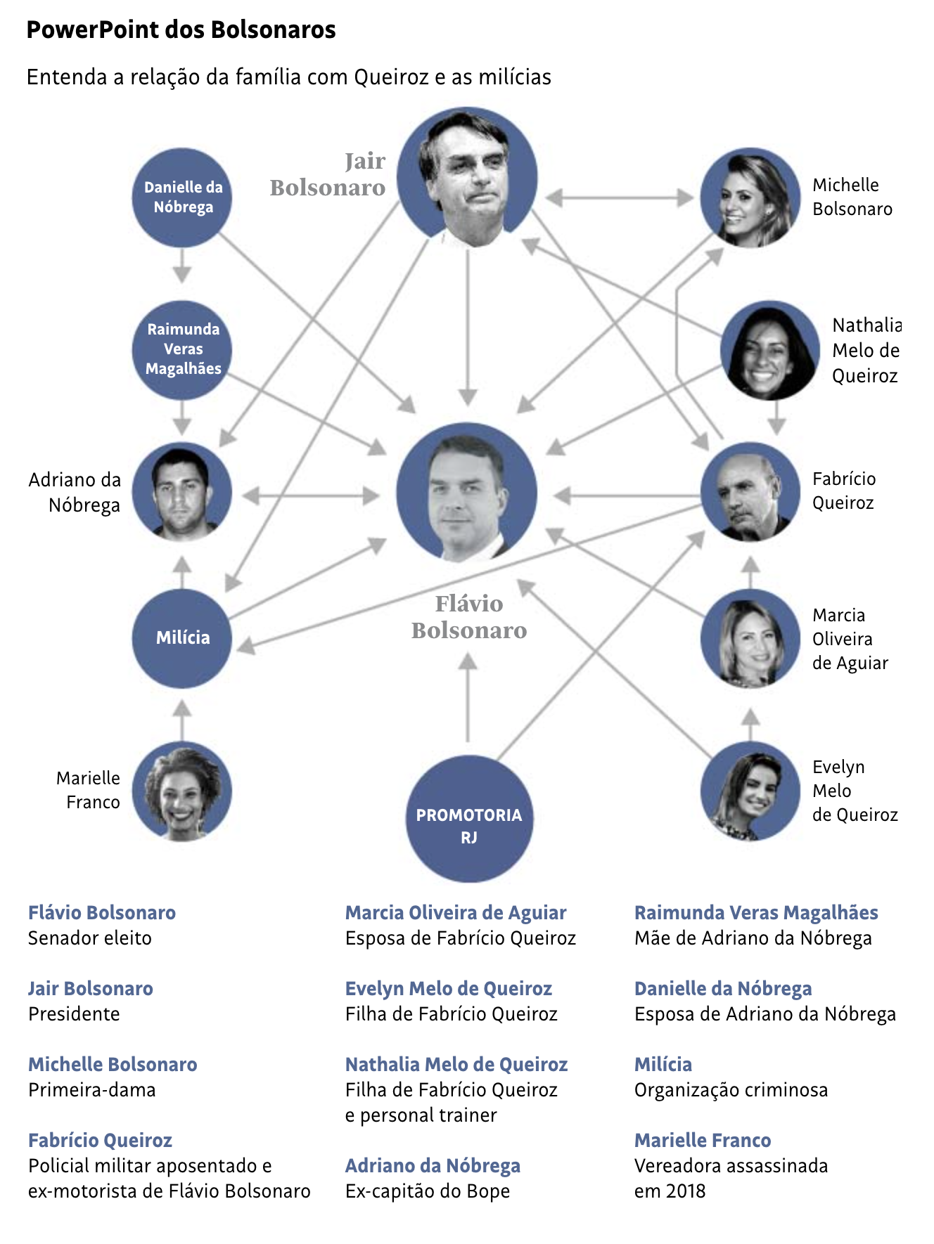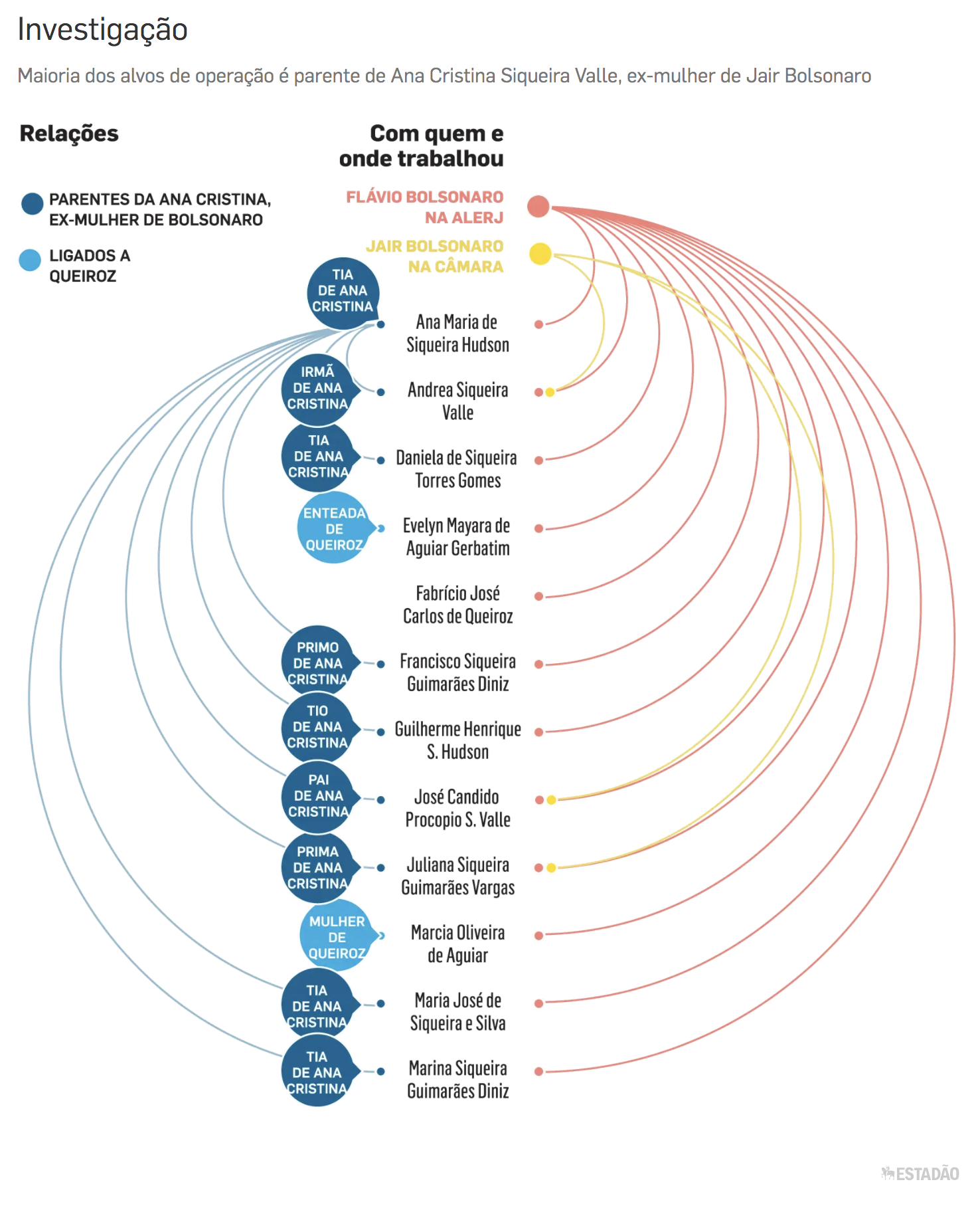 Empregou a mãe e a esposa do ex-capitão do Bope Adriano de Magalhães da Nóbrega no gabinete de Flávio, além dos próprios familiares (esposa, ex-marido da esposa, filhas e enteada) e da ex-mulher de Jair Bolsonaro, Ana Cristina Siqueira Valle e parentes dela.