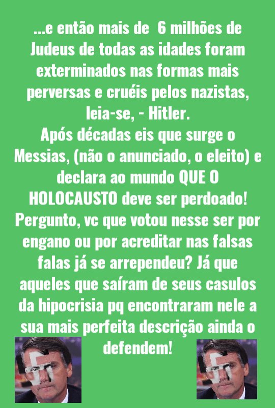 Nós sempre iremos nos opor a aqueles que negam a verdade ou aos que desejam expurgar nossa memória — nem indivíduos ou grupos, nem líderes de partidos ou premiês. Nós nunca vamos perdoar nem esquecer. Reuven Rivlin, presidente de Israel, sobre declaração de Bolsonaro a líderes evangélicos de que o Holocausto não pode ser esquecido, mas pode ser perdoado
