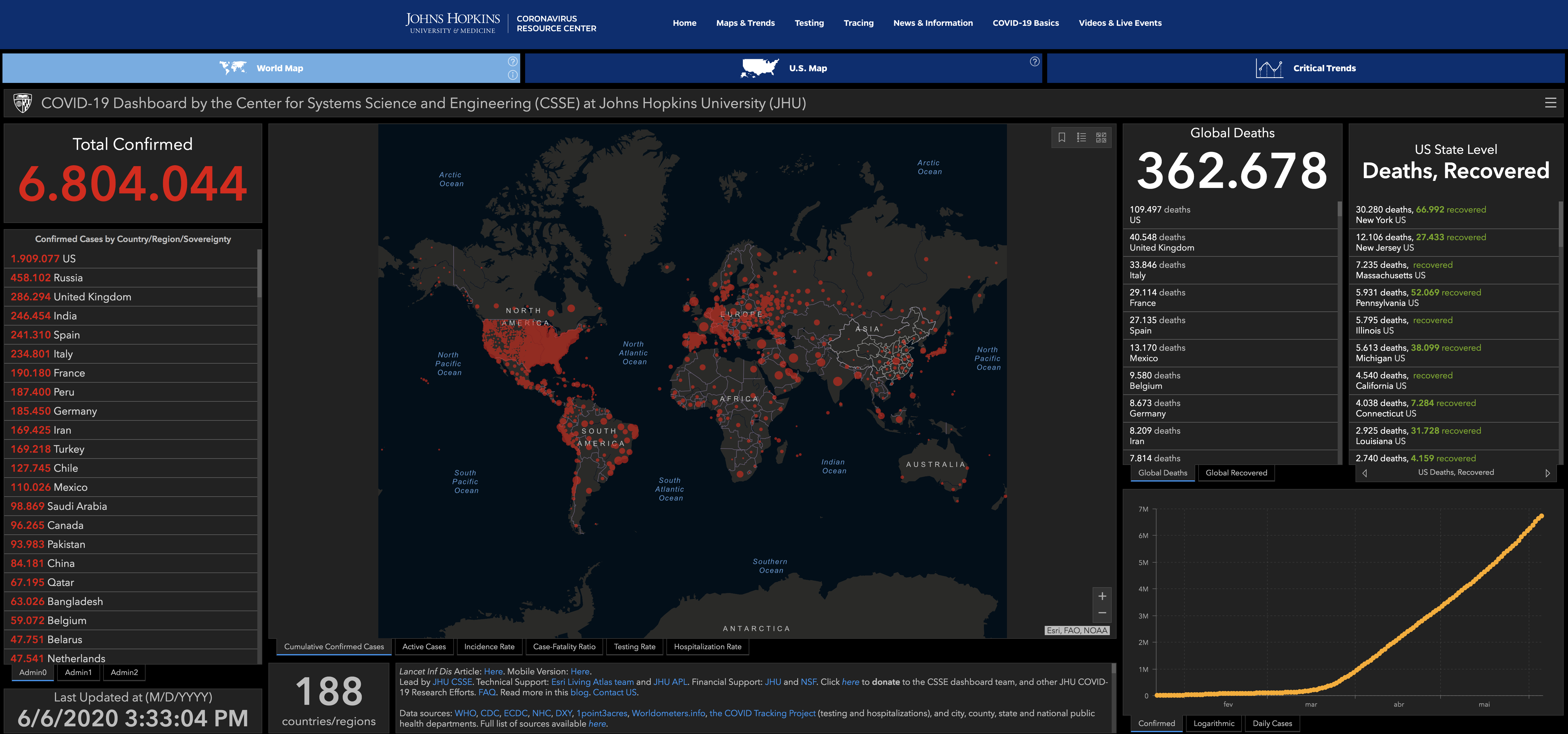 Os números relativos ao Brasil também sumiram do mapa interativo construído pela Universidade de Johns Hopkins, dos Estados Unidos, utilizada como uma das referências para internautas de todo o planeta.