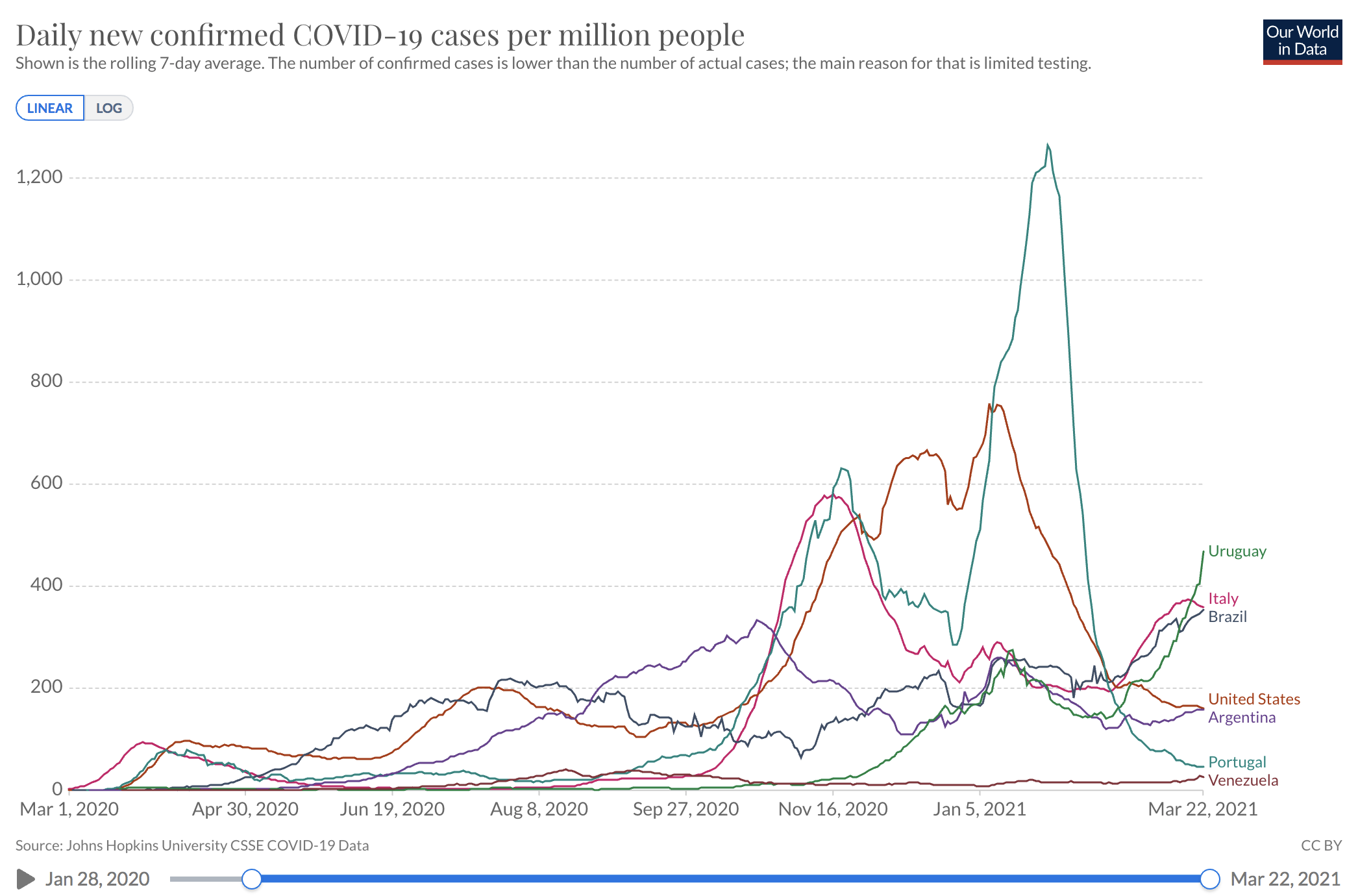 No balanço desta tarde, o Brasil atingiu a média móvel recorde de 75.163 novos casos, 10% acima de duas semanas atrás.