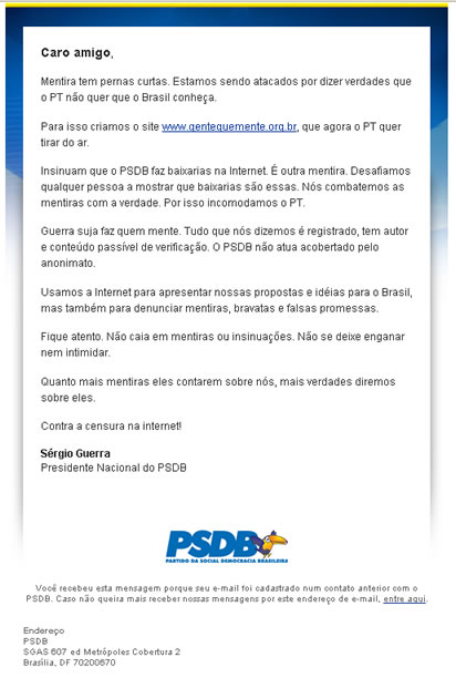 Do presidente do PSDB, em e-mail enviado a cadastrados pelo partido: