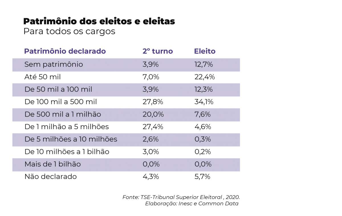 Em relação ao patrimônio, as candidaturas eleitas se concentram mais na faixa de R$ 100 a R$ 500 mil, R$ 1 milhão a R$ 5 milhões, e R$ 500 mil a R$ 1 milhão, respectivamente.