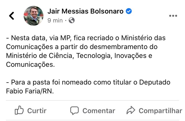 “O Ministério da Comunicação, recriado por Bolsonaro,