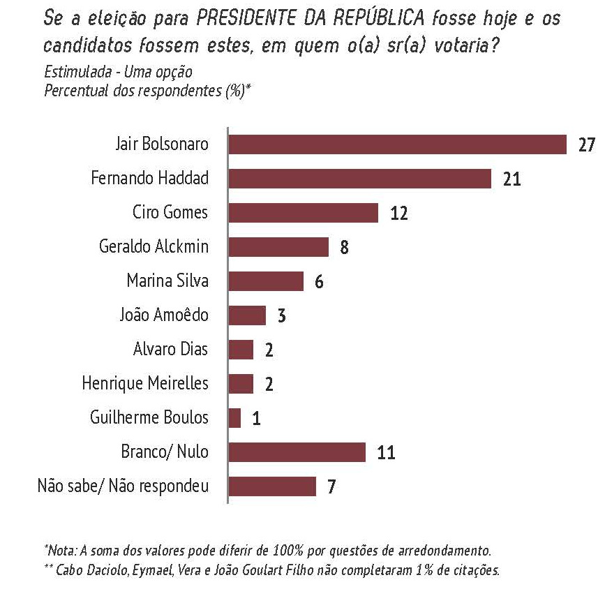 Já na pesquisa estimulada, Haddad foi de 22% para 21%. Jair Bolsonaro (PSL) também oscilou 1 ponto, indo de 28% para 27%.