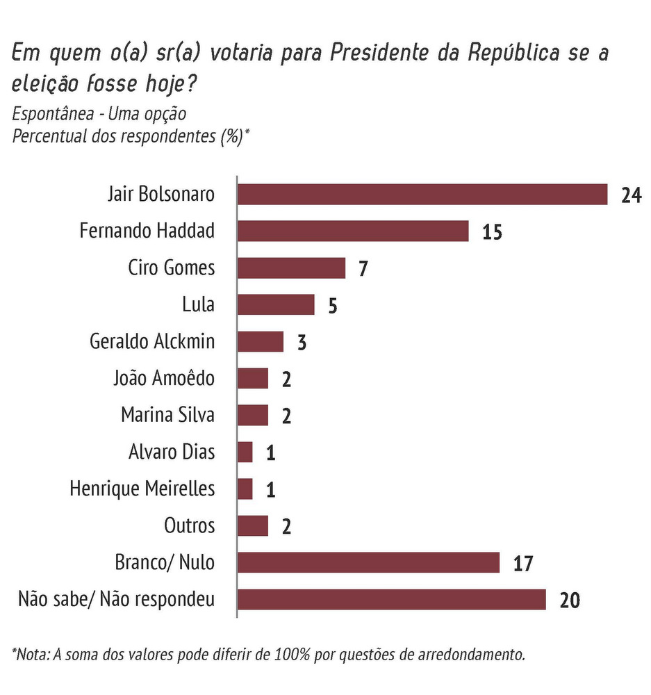 Na pesquisa espontânea, o candidato Jair Bolsonaro (PSL) lidera com 24% das intenções de voto.
