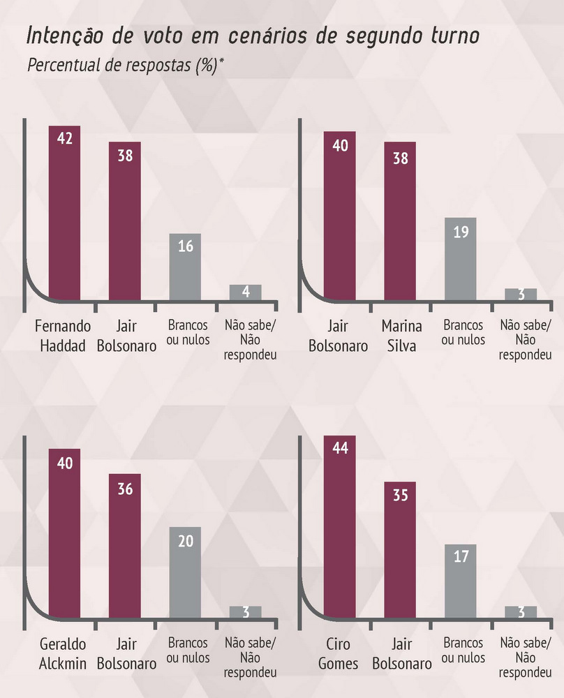 Haddad e Alckmin venceriam por uma diferença de 4 pontos percentuais. Já Ciro teria vantagem de 9 pontos percentuais sobre Bolsonaro.