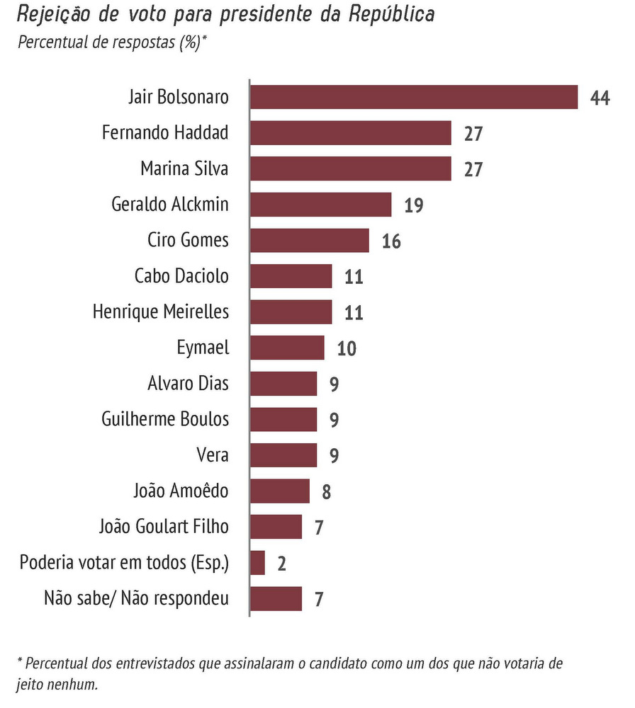 Bolsonaro segue o candidato mais rejeitado: 44% dos entrevistados na pesquisa disseram que não votariam nele de jeito algum.