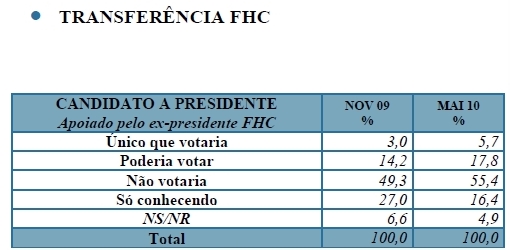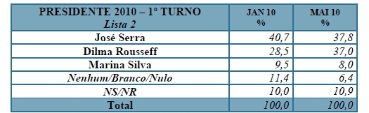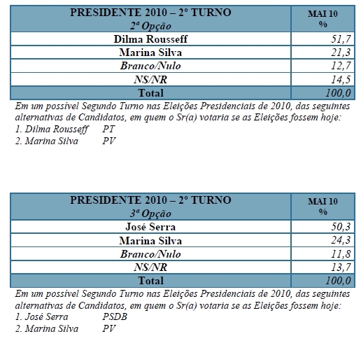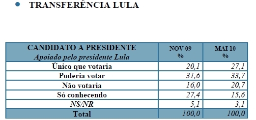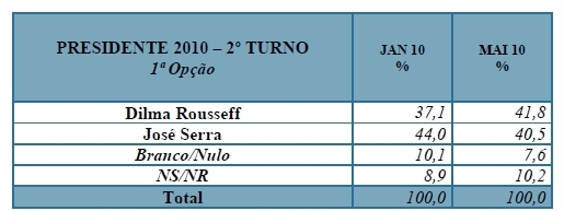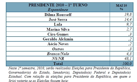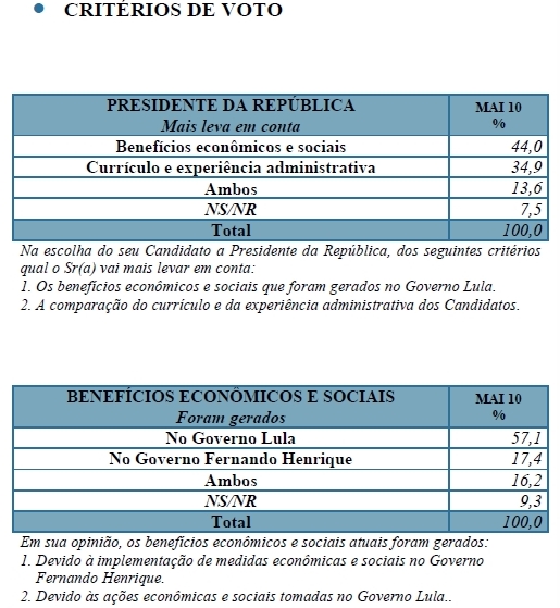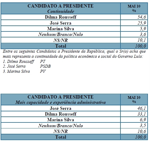 “O país encontra-se em momento extremamente favorável, com Lula e o Governo atingindo índices recordes de aprovação. Dilma Rousseff aparece pela primeira à frente de José Serra nas eleições presidenciais”, avalia a pesquisa Sensus. “A população pede a continuidade da política econômica e social no país, e a legitimidade do Governo possibilita a complementação das reformas necessárias.”