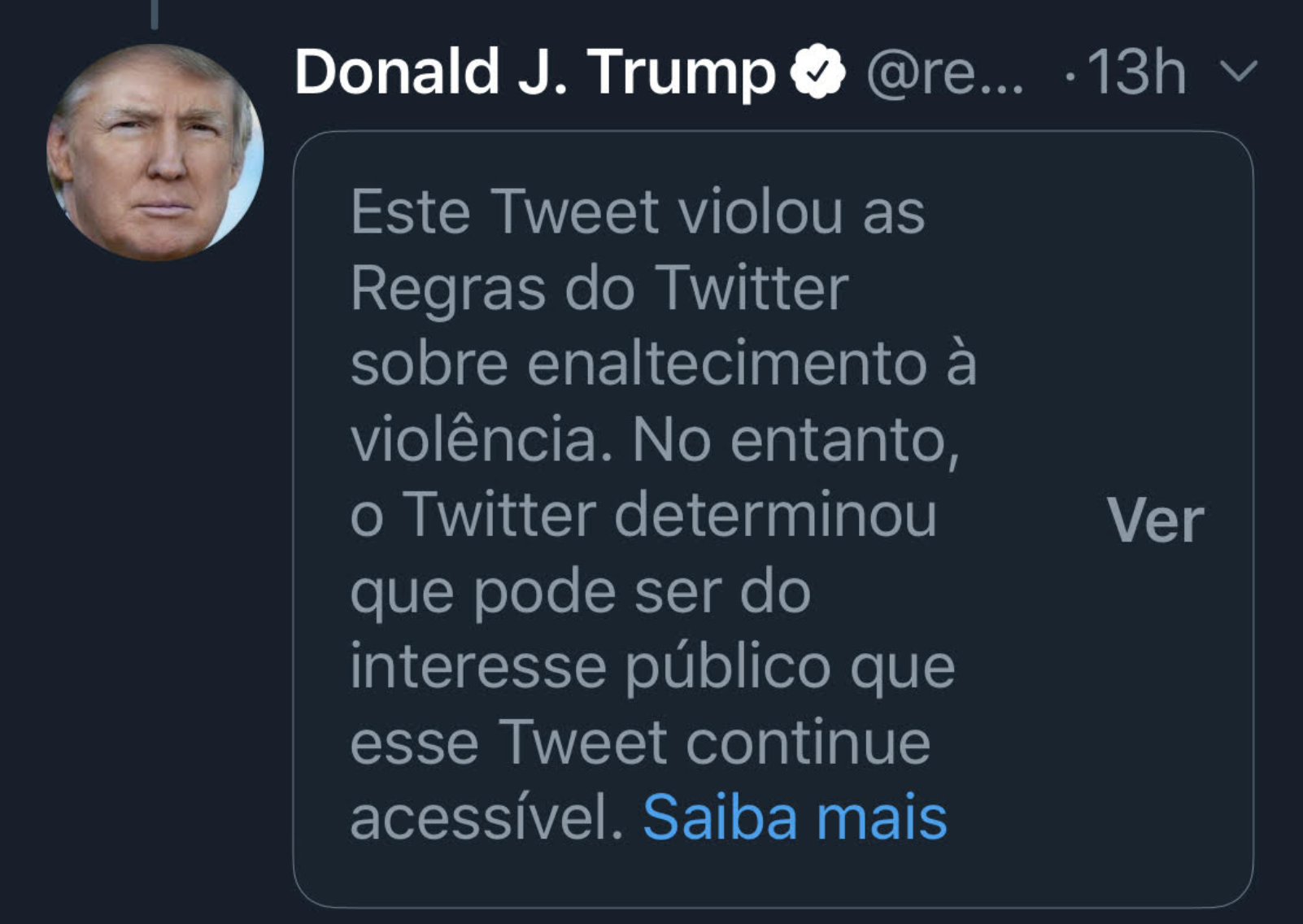 Mais uma vez, a plataforma interferiu: assinalou a mensagem de Donald Trump como possível incitação à violência, embora tenha mantido a mensagem no ar por considerá-la “de interesse público”.