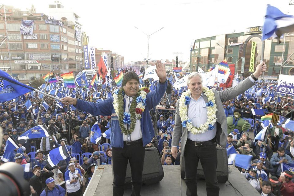 Morales e Linera saúdam os apoiadores no encerramento da campanha. Foto: Divulgação/Facebook