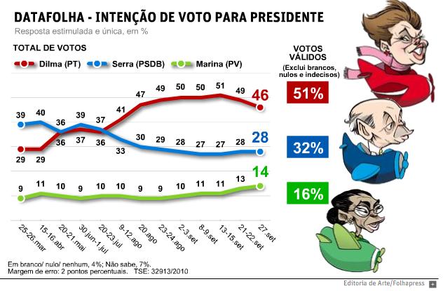 Na média das quatro sondagens mais recentes, porém, Dilma ainda ganharia no primeiro turno, com 55% dos votos válidos. Entraram no cálculo da média duas pesquisas feitas pelo Datafolha, uma do Ibope e outra do Vox Populi, todas concluídas nos últimos quatro dias. A média tem a vantagem de diluir eventuais pontos fora da curva em uma sequência de pesquisas, mas é mais lenta para detectar mudanças bruscas de tendência do eleitorado.