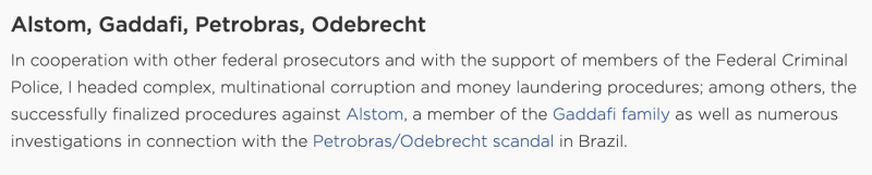No seu currículo, menciona que participou de investigações complexas, com as dos casos Alstom, de um integrante da família do ditador líbio Muamar Kadafi e do escândalo Petrobras/Odebrecht.