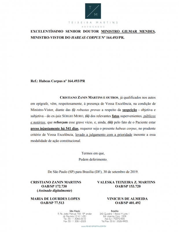 Política Defesa de Lula pede urgência a Gilmar Mendes no julgamento da suspeição de Moro; íntegra 30/09/2019 - 21:38 Tempo de leitura: < 1 min Foto: Nelson Jr./SCO/STF Apoie o VIOMUNDO R$ 5 R$ 15 R$ 35 Qualquer valor Siga-nos no