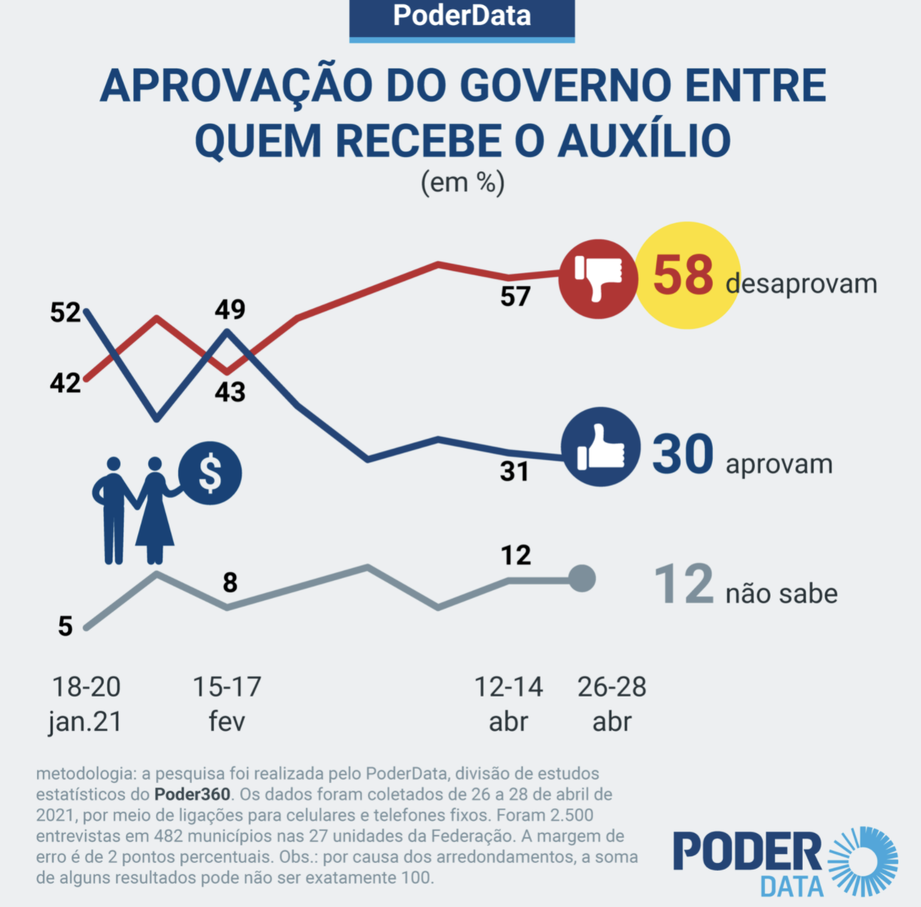 Pesquisa do Poder Data, publicada pelo Poder360, mostra que mesmo entre as pessoas que estão recebendo a nova rodada do auxílio emergencial a rejeição ao presidente Jair Bolsonaro cresceu para 58%.