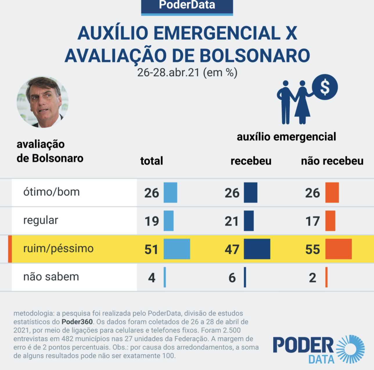 O índice de ruim/péssimo do presidente é de 55% entre os que não recebem o auxílio e de 47% entre os que recebem.