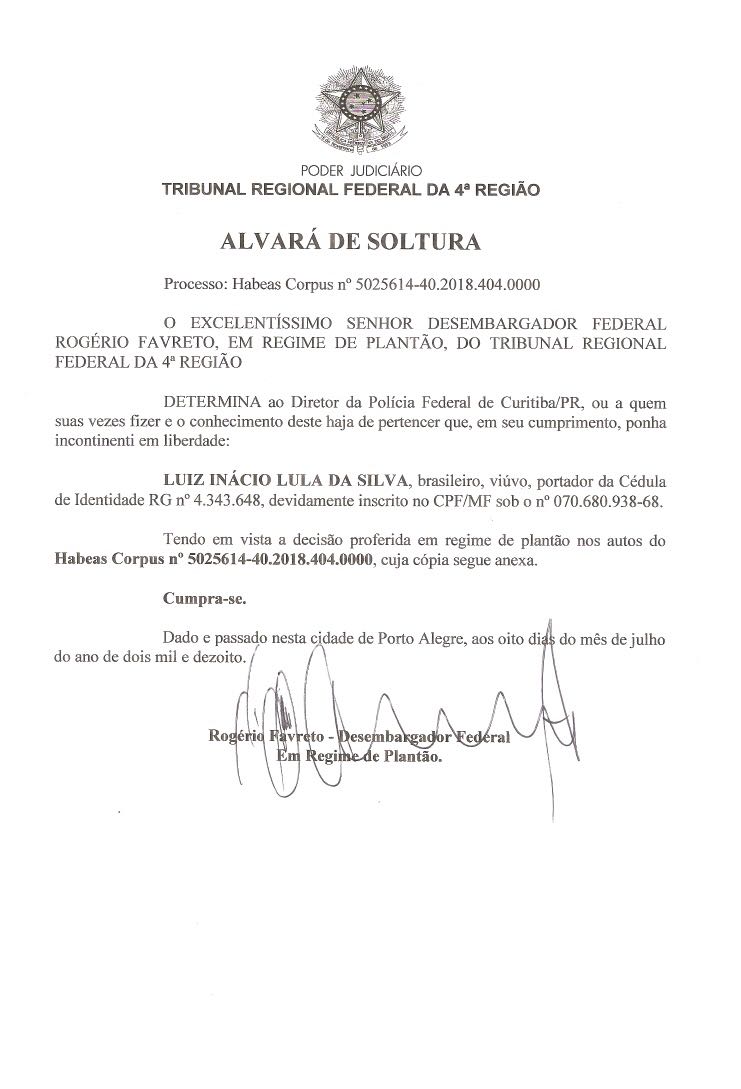 O desembargador Rogério Favreto acatou habeas corpus apresentado na sexta (6) pelos deputados Wadih Damous, Paulo Pimenta e Paulo Teixeira, do PT, pedindo que ele fosse libertado imediatamente pois não haveria fundamento jurídico para a prisão dele.